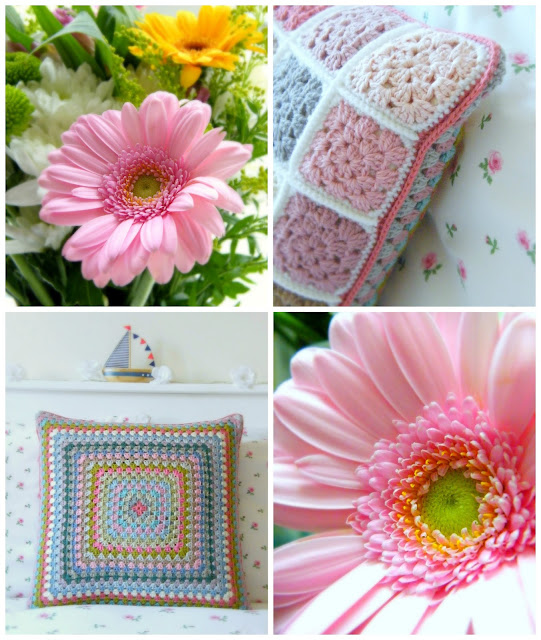 One of the things I love about crochet is how it can look so different in varying light. The colours change depending on the time of day, and the weather of course. Natural light is always the best. I bought a sweet spray of flowers yesterday, and by happy coincidence they really compliment my finished project. The pink Gerbera are so pretty.
